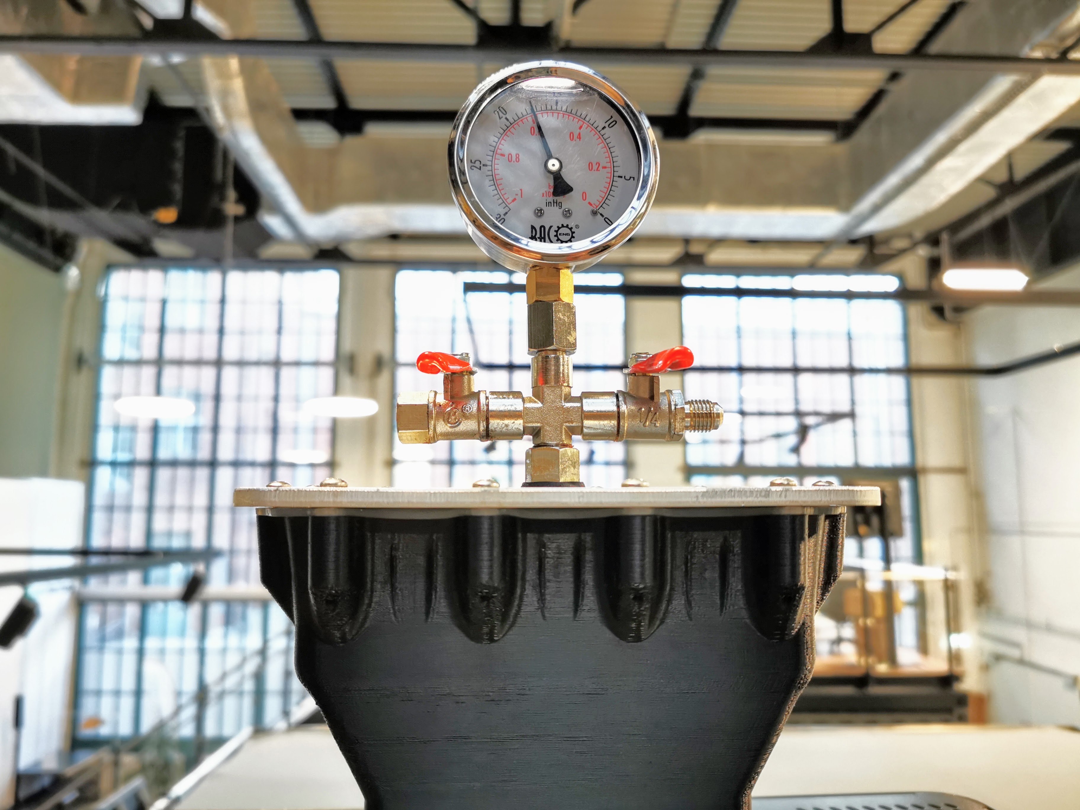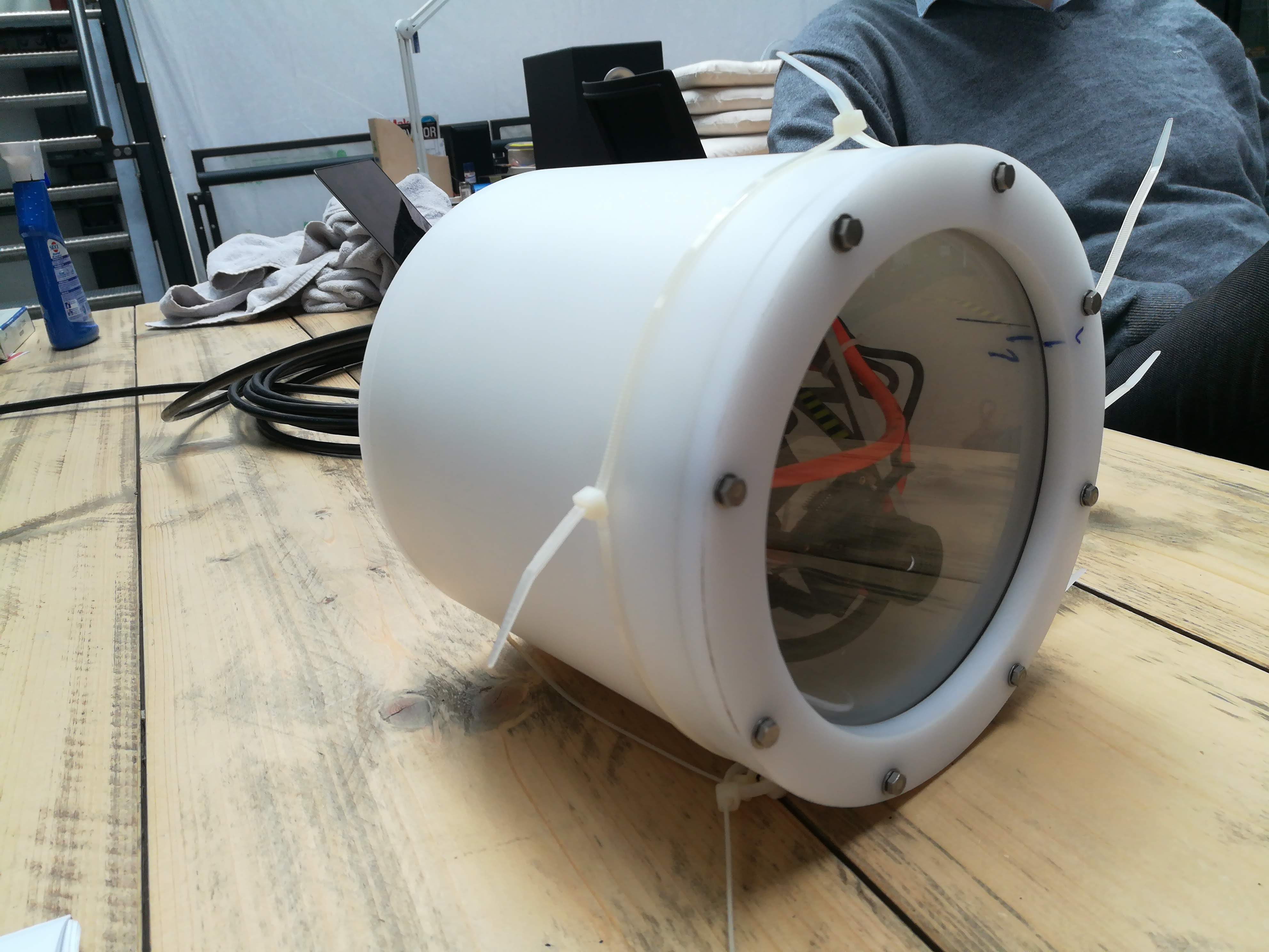 The picture above shows the finished 3D printed underwater camera housing, named NIMAS (Non-Invasive Monitoring of Aquaculture Systems), undergoing a vacuum pressure leak test.